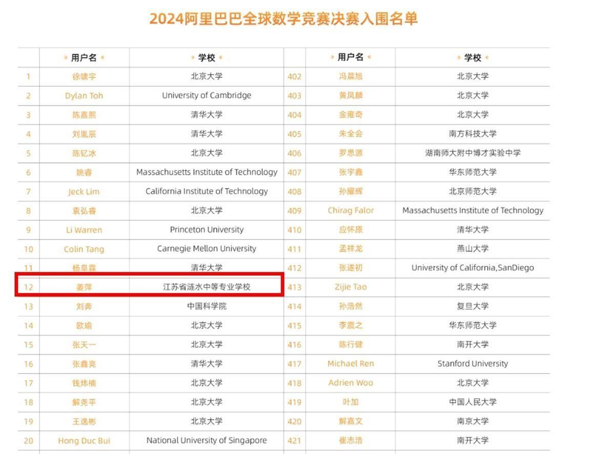 2024年4月,阿里巴巴全球数学竞赛初赛中,姜萍的名字赫然出现在榜单前列——全球第12。