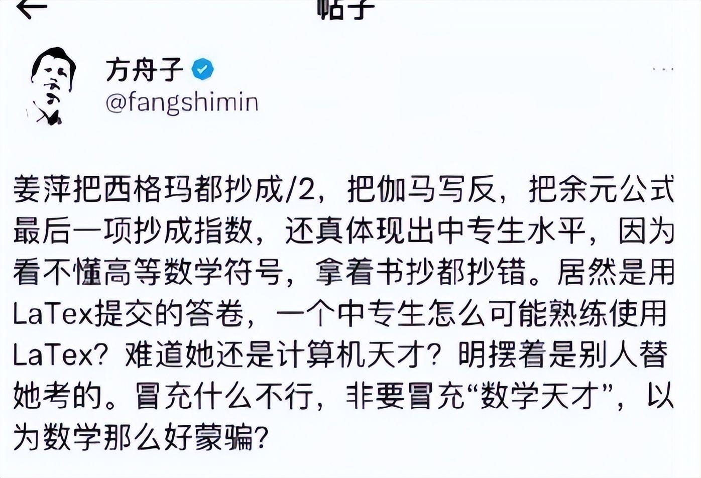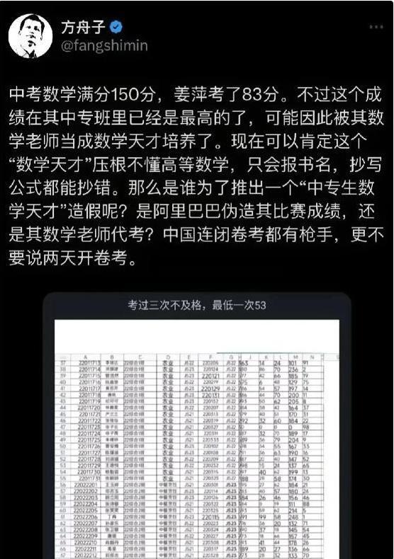 最先方舟子站了出来,他翻出姜萍在中专的月考成绩并质疑:数学83分,满分150,这是能在国际竞赛中拿到前十二的人?