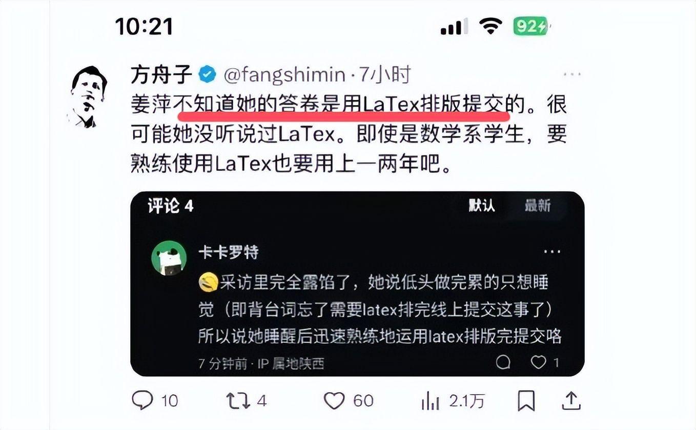 还有一些网友扒出了,姜萍提交的答卷是用LaTeX排版的,而这个学术软件连研究生都要花一两年才能熟练掌握,一个中专女孩能用得这么熟练?