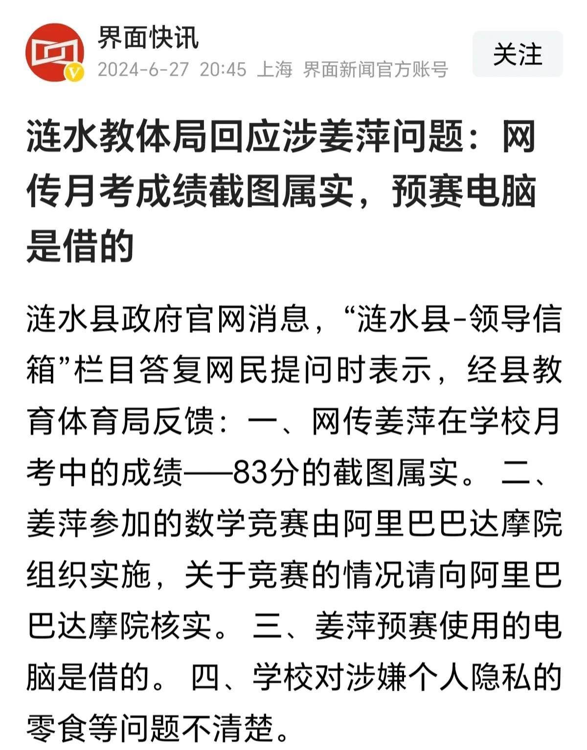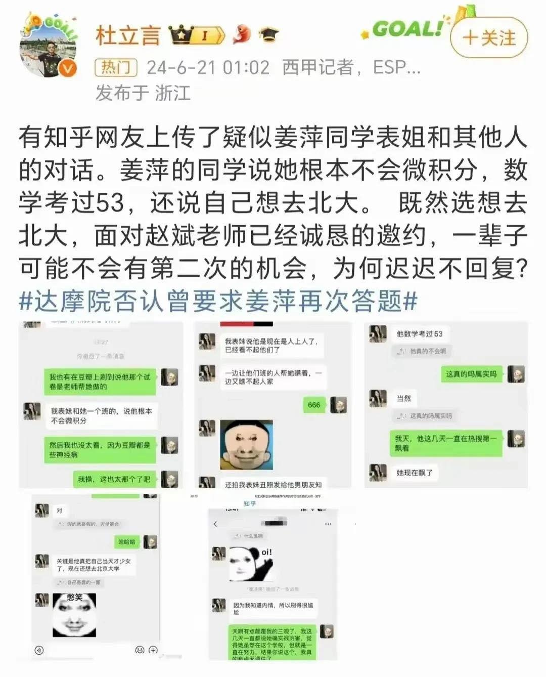 言下之意就是,姜萍成绩作假。