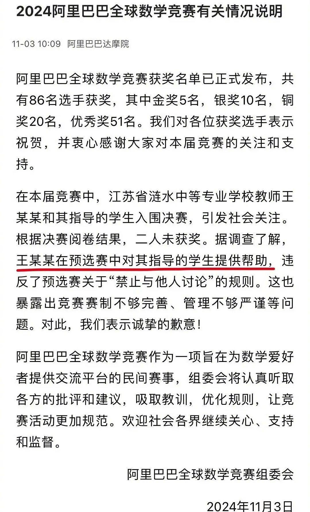 阿里达摩院公布决赛成绩,86人获奖名单里没有姜萍,随之而来的,是一纸公告:原来姜萍在初赛中接受了老师的帮助,违反了“不允许与他人讨论”的规则。