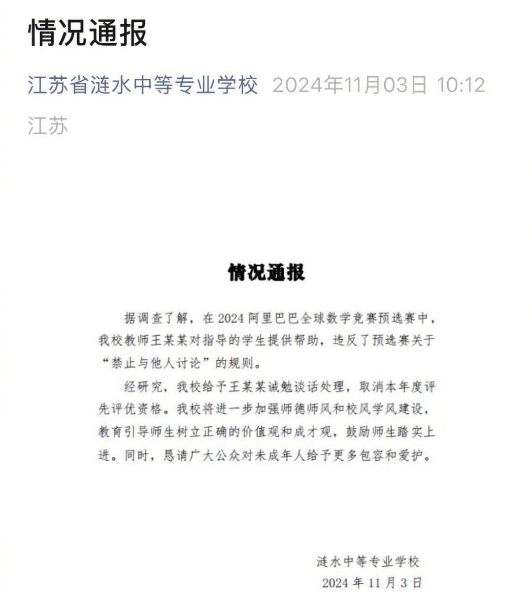 随后涟水中专也迅速跟进,承认姜萍在初赛作弊,并对她的数学老师王某作出处罚——取消年度评优资格,进行诫勉谈话。